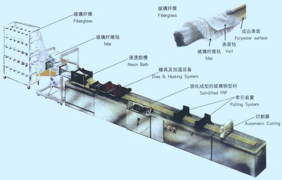 拉擠成型工藝是將浸透膠液的連續(xù)無捻粗紗、氈、帶或布等增強(qiáng)材料,在牽引力的作用下,通過模具加熱擠拉成型、固化,連續(xù)不斷地生產(chǎn)長(zhǎng)度不限的玻璃鋼型材。